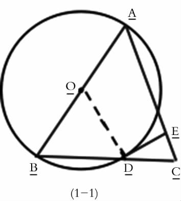 新教材着重于由学生自己探索知识的形成过程,强调用数学知识解决实际问题,为实现用数学知识去解决实际问题,教学中就必须注重题型创新。如:如图(1-1)以等腰三角形ABC的一腰AB为直径的⊙O交底边BC于D,过D作DE⊥AC于E,求证:DE是⊙O的切线。