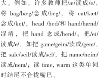 2. 重音、失去爆破音读不到位。汉字没有重音的现象,而英语单词包括单音节、双音节和多音节,不少教师容易读错多音节单词的重音,主要是由于没有掌握重读音节的语调,常常混淆在首音节、第二个音节和末音节的重音,导致重音移位。爆破音要失去爆破,即口型和舌位摆在发该爆破音的位置,但没有发出来。有些教师没有掌握这一规则,把爆破音也清晰地发出来。如把goodbye /ˊgudbai/里的/d/也读出来。