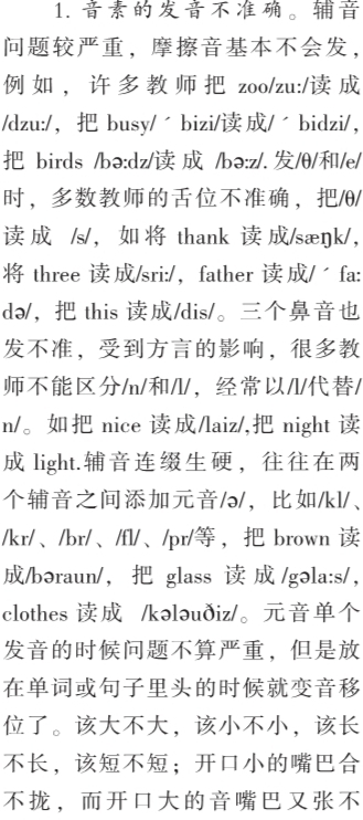 3. 没有连读的习惯,句子的语调不流畅。很多教师在朗读句子的时候没有连读的习惯,一个一个词语响亮地读出来,显得生硬不流畅,如“What did you do on Sundays?”did和on应该弱读,第二个do就要重读,而有些教师把每个单词都读得很强。