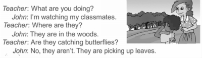 地点是野外,是John and Miss White之间的对话。新语言点是:Are they …ing? Yes, they are. No, they aren’t. 旧知识是有关描述outdoor activities的V+ing动词短语,提问时间、地点和一般的情况描述。根据本班学生也有过野外旅游的经历,我这样设计“A Field Trip”第一课时的教学。