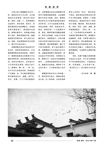 就像演员要求有自己的风格一样,教学要有生命力,教师必须有自己独一无二的风格,从而形成教师身上无形的“印记”。教态要有个性化,就必须良好的体态语言和行为习惯为前提。珍惜每一个表情的信息传达,肢体语言设计上要坚持少而精、精而准、雅而美的原则,得体、到位、适时、适候,要杜绝频繁复杂。“两句一招,三句一式”只会导致学生审美疲劳,有失教师严谨和课堂严肃;教师要注意把眼神、表情、手势等与教学内容、教学语言、师生感情协调,使得整体肢体语言衔接轻松自然,教学才富有艺术魅力,才能给学生和谐美德感觉,从而使语文课教学渐臻佳境。