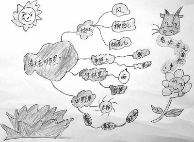 笔者在进行《春天在哪里》一课的教学时,指导学生以四人小组为单位,共同合作绘制思维导图,学生在理顺课文脉络的同时,充分整合研读了与课文相关的资源,教师在此基础上再进行指导,升华了文章的主题。形成了以下生动的理顺课文篇章的思维导图(见图3)。