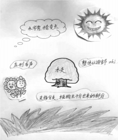 小学阶段的识字量是很大的,大约要学会常用汉字2500个。要求能读准字音,认清字形,了解字义,并能正确地书写运用。如《春天在哪里》一课中要求会写的生字有7个“洒、换、探、暖、枝、野、原”,以“枝”字为例,我是这样通过运用文字和图片思维导图帮助学生学会生字的音、形、义(见图1)。