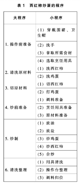 如教学“西红柿炒蛋”这一技能,我用任务分析法把其划分为6项大程序、19项小程序,如下表所示。