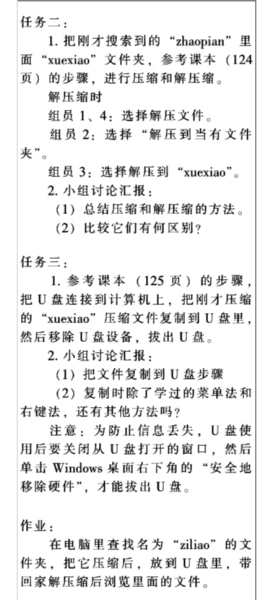 “微课”是针对解决某个知识点、重难点的学习资源,主要是以视频为表现形式,其主要功能是“传道、授业、解惑”。因为本课教学重点是“文件的查找与压缩”,教学难点是“压缩与解压缩”,所以“微课”设计上以解决文件的查找和文件的压缩与解压缩为主。“微课”是借助网络平台,让学生课前完成,因此制作了3个微视频:①文件的查找;②文件的压缩与解压缩;③移动存储设备的使用,主要是让学生学会基本的操作步骤。设置了任务单:①观看视频“文件的查找”,总结在电脑中查找文件的步骤;②观看视频“文件的压缩与解压缩”,总结压缩的步骤、解压缩的步骤;③观看视频“移动存储设备的使用”,说出怎样使用U盘。由于学校暂时未能提供网络交互平台,因此借助家长Q群,把微视频发布到网上,让学生完成课前学习。学生在学习中遇到疑问,教师和同学在Q群中给予帮助。为了了解学生学习情况,在课堂开始利用2-3分钟,通过“知新教学评价系统”对学生进行测试,通过测试统计及时调整教学策略。