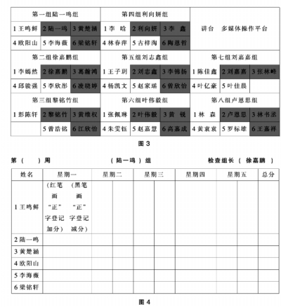 2.及时登记。班级的管理以八个合作小组为单位,把学校的“文明”班级建设、日常行为规范、甚至每次的考试成绩、每一项活动采用量化评分的方式融入这个管理模式中,那么除了要求组长要有很强的责任心外,设计简便可行的登记方法可起到事半功倍的效果。(登记表示例见图4)