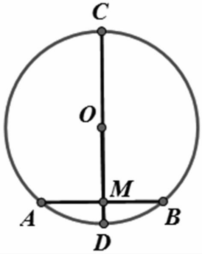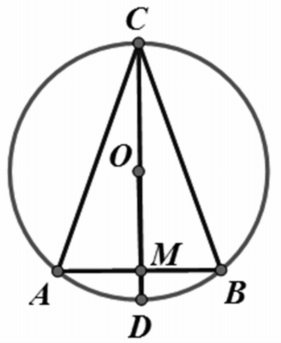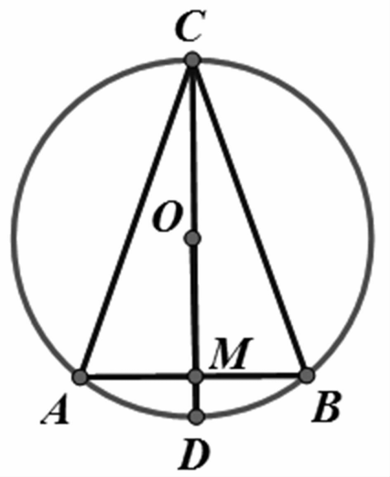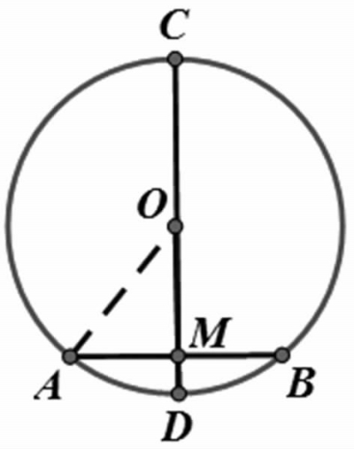 (方法二)由直径CD⊥AB于点M,联想垂径定理的基本图形(如图8),可以连接AO构造Rt△AOM,可得圆心角∠AOM等于圆周角∠ACB(如图9),于是sin∠AOM=sin∠ACB = ■,所以■=■,可求AM=■,得AB=9。