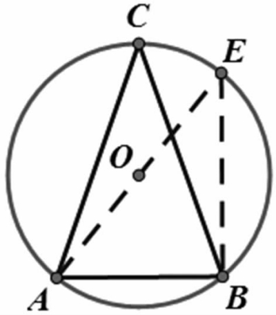 分析:(方法一)因为∠C是圆周角(如图6)且已知圆的直径等于15,要求弦AB 的长,则考虑连AO并延长交⊙O于点E,利用直径所对的圆周角是90°构造Rt△ABE(如图7),得∠E=∠C,∵sin∠ACB=■,∴sin∠AEB=■,可求AB=9。