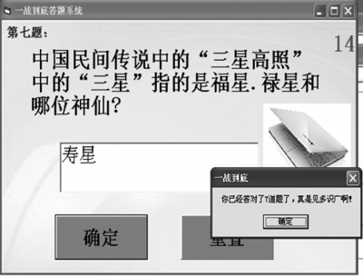 中职学生普遍文化知识水平较差,对语言程序设计课程具有畏难、畏学的情绪,这就要求教师在案例的选取时,要充分地考虑教学对象即学生的接受能力。尽可能地选取学生喜闻乐见,适合学生生理、心理特征的案例。不能不切实际地追求案例的深度和广度。如在分析循环结构的运行过程时,选取简单的累加案例,是非常适合学生的认知水平的。再如,在介绍IF选择结构时,大部分的中职VB教材中都采用判断二元一次方程是否有解的这一实例。但中职生大部分都非常怕学习数学,数字基础也比较差,用这样的例子既枯燥学生又不感兴趣,针对这一情况,笔者多年来都是将这一知识点融入到模拟江苏卫视“一站到底”制作如图3所示的答题系统这一案例中来。这一教学案例《我也能战出<一站到底>》也因为学生的“乐学”效果明显而在全国中职教师信息化教学设计与说课比赛时荣获一等奖。
