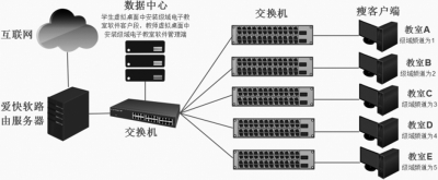 根据学校云机房的特点,提出了一套教师实时控制网络的方案。如下图三所示云机房的网络拓扑结构图。云机房中数据中心通过交换机与瘦客户端通信,教师和学生通过瘦客户机访问数据中心的虚拟桌面。教师通过级域电子教室软件对学生的虚拟桌面进行控制,云机房和外网的交互通过爱快软路由服务器实现。