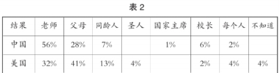 美国问卷调查中学生心中最棒的人物比较丰富,有自己、有同学、有认可教师的, 人名比较散乱,与被调查班级教师访谈了解,孩子各有各的本事,非学习成绩好的,可以看出美国孩子更多拥有自信,并将教师当做了班级一员,因为平时评价的多元,因此学生彼此欣赏的角度也丰富起来。但在中国问卷中,学生相对集中写的是同学,其中一般集中在班级的班长,是那些学习能力强和管理能力强的人。其他学生也有一个共同点就是学习成绩都比较优异,还热心助人,大方宽容。有此可以从一个角度看到,学生更关注老师对学业的评价,而倾斜对这样学生的欣赏。
