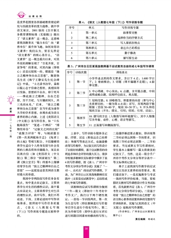 基于上述我国写作教学的应试现实以及语文素养的培育要求,我们建议如下:一是实施教学与考试一致的写作评价标准。当前,要根据语文教材写作课程设计作文考试标准,首先就要否定《表1:广州市中考作文分项分等评分表》;二是基于培育“独立之精神和自由之思想”的语文核心素养而设置具体而完整的写作训练体系,实施与《美国语文(中文版)》接轨的写作课程。