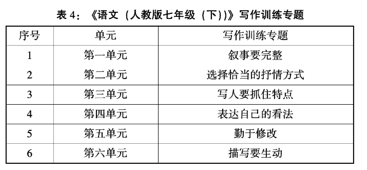 我国中学两阶段写作任务各有重点。初中重点在记叙文,主要培养学生对生活的感性认识;高中重点在议论文,主要培养学生对生活的理性认识。高中写作,我们不再论述。下面,主要论述初中写作训练体系。按照初中写作任务的重点,《语文(人教版七年级(下))》写作训练专题是比较科学的。