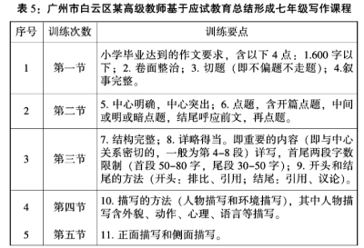 该教师的应试写作课程为做到“三年一篇文(即初中三年考好中考作文)”,执行以下两个硬性规定:一是每一节训练两次,第一次为生态写作(即在教师进行写作指导后学生进行个性化写作),第二次为升格写作(即学生进行互评后进行同题目同素材的修改性写作);二是循序渐进要点叠加,即训练第二节时必须达到第一节的要求,训练第三节时必须达到第一、二节的要求。当完成第五节写作课程时,学生基本上能够写一篇文质兼美的记叙文了。当然,这是一篇合乎广州市中考作文分项分等评分表中一等文标准的记叙文。