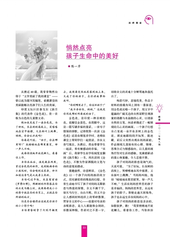 童趣盎然,诗意鲜活。《金色花》以一个孩子向妈妈独语的方式,用充满觉悟的稚真的幻想,非常生动地书写了孩子对妈妈无限依恋与热爱的深情。全文不满千字,却天马行空、自由不羁,但又不会让人感到材料组织上的零碎散漫。贯穿全文的中心——幼童对母亲的亲昵依恋,是人人都能体会到的,形散而神凝。作者对之不著一字,却将全文的灵魂十分鲜明地和盘托出了。