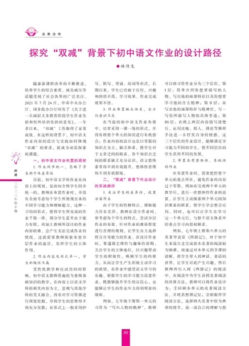 随着新课程改革的不断推进,培养学生的综合素质、减负减压等话题受到了社会各界的广泛关注。2021年7月24日,中共中央办公厅、国务院办公厅印发了《关于进一步减轻义务教育阶段学生作业负担和校外培训负担的意见》,一年多以来,“双减”工作取得了显著成效。在这样的背景下,初中语文作业内容的设计与实践如何体现“双减”的要求,就成为亟需探索的课题。
